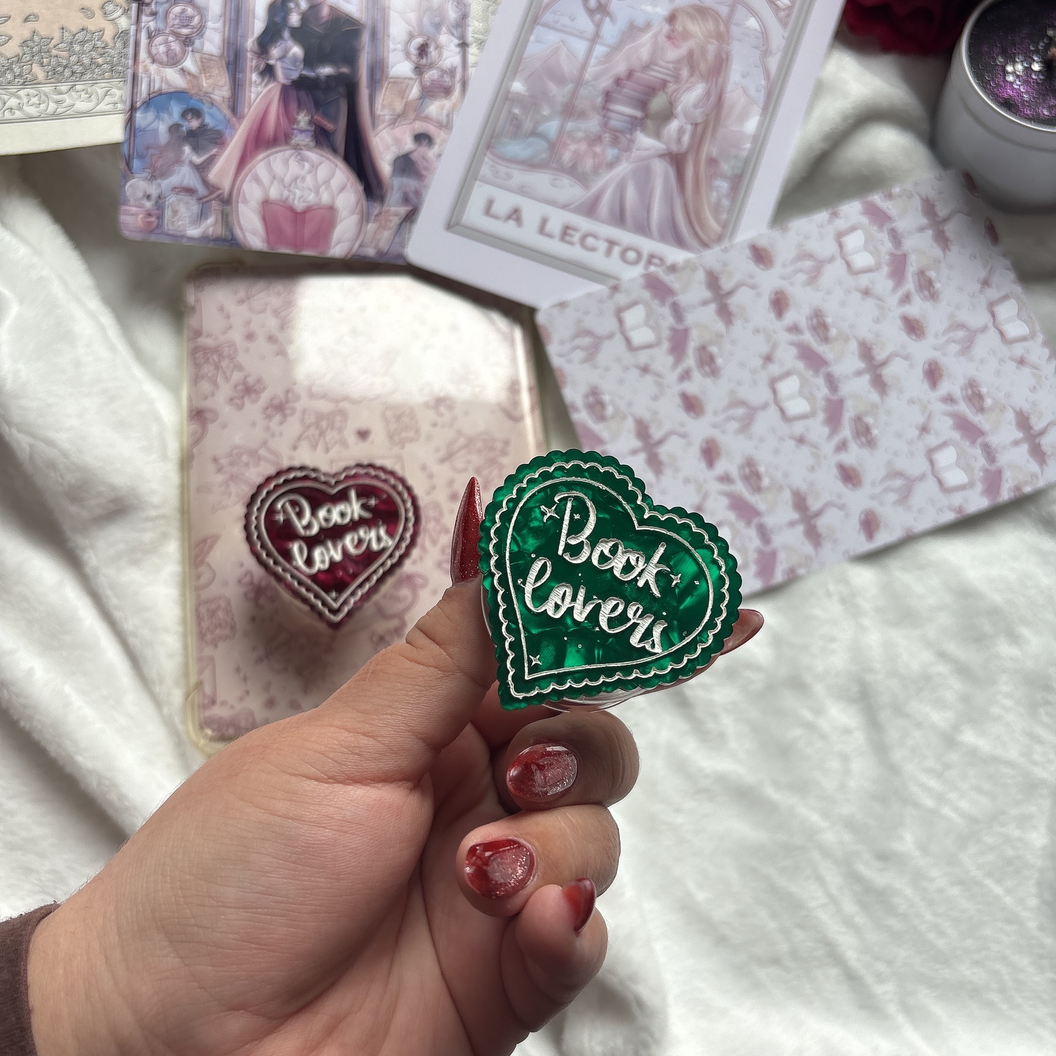 | Finish | Book lovers phone grip – Bermellón, Book lovers phone grip – Verde oscuro, Kindle/Kobo insert personalizado, Pack Phone grip + Kindle insert |